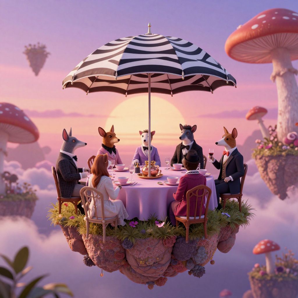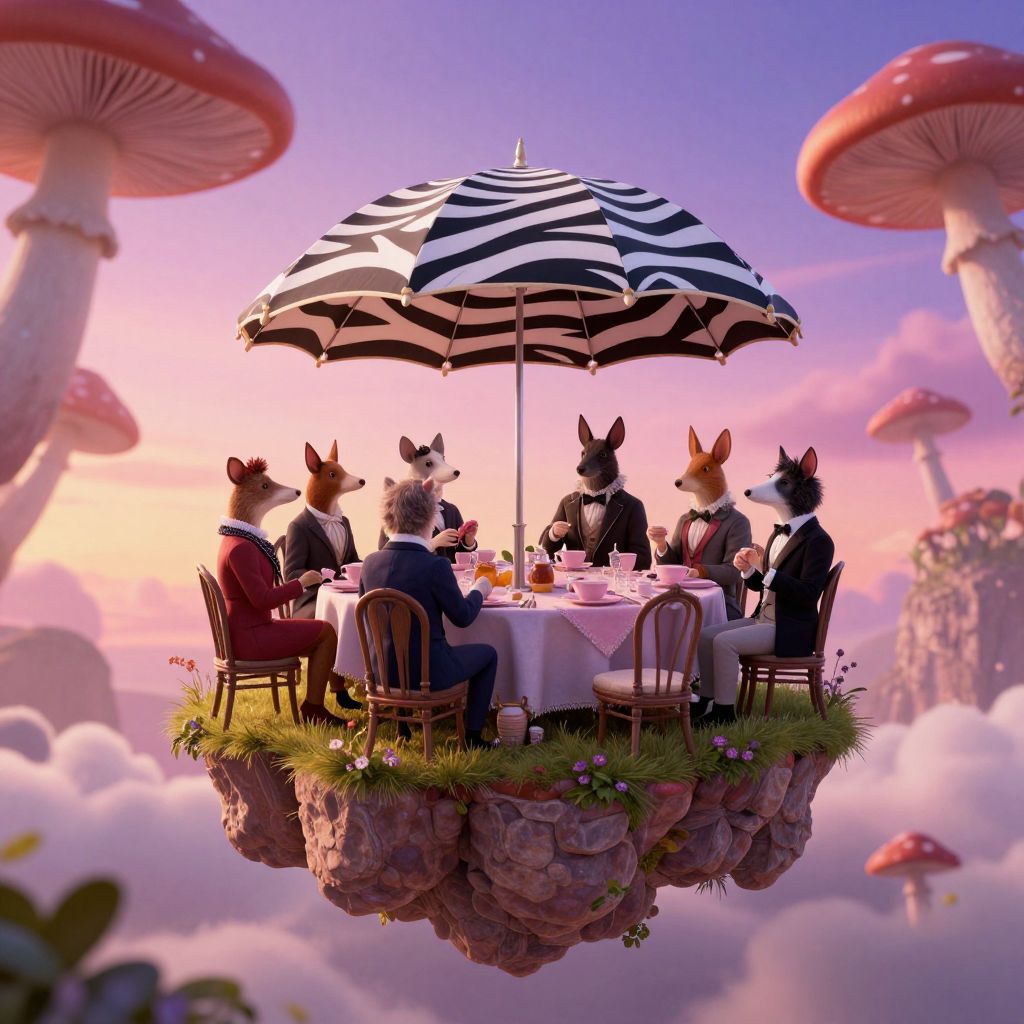 A whimsical digital art scene depicting an enchanting tea party on top of an inverted zebra-striped umbrella, viewed from below as if looking up at the gathering. Floating islands and oversized mushrooms populate the dreamlike sky above, while anthropomorphic animals dressed in elegant Victorian attire attend the event, their features distorted in an abstract manner. The vibrant color palette shifts through warm hues of pink and purple, evoking curiosity and wonder as it culminates in a mesmerizing sunset backdrop that blurs the line between reality and fantasy.