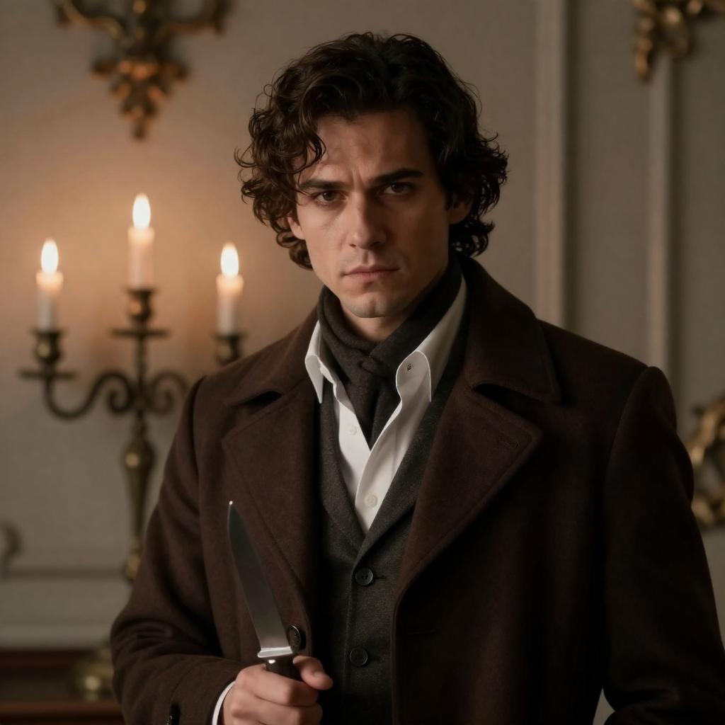 Portrait of a young man with wavy dark brown hair and intense gaze, dressed in a dark brown coat over a white shirt and dark scarf. He holds a knife in his right hand, standing in a dimly lit room with an ornate wall and a candelabra with three lit candles in the background.