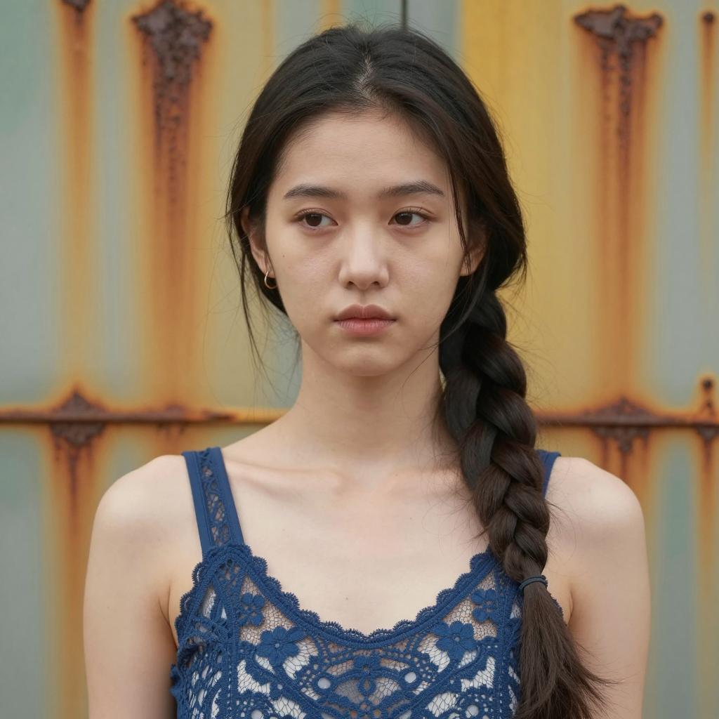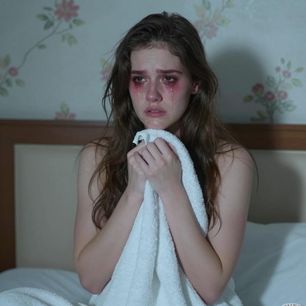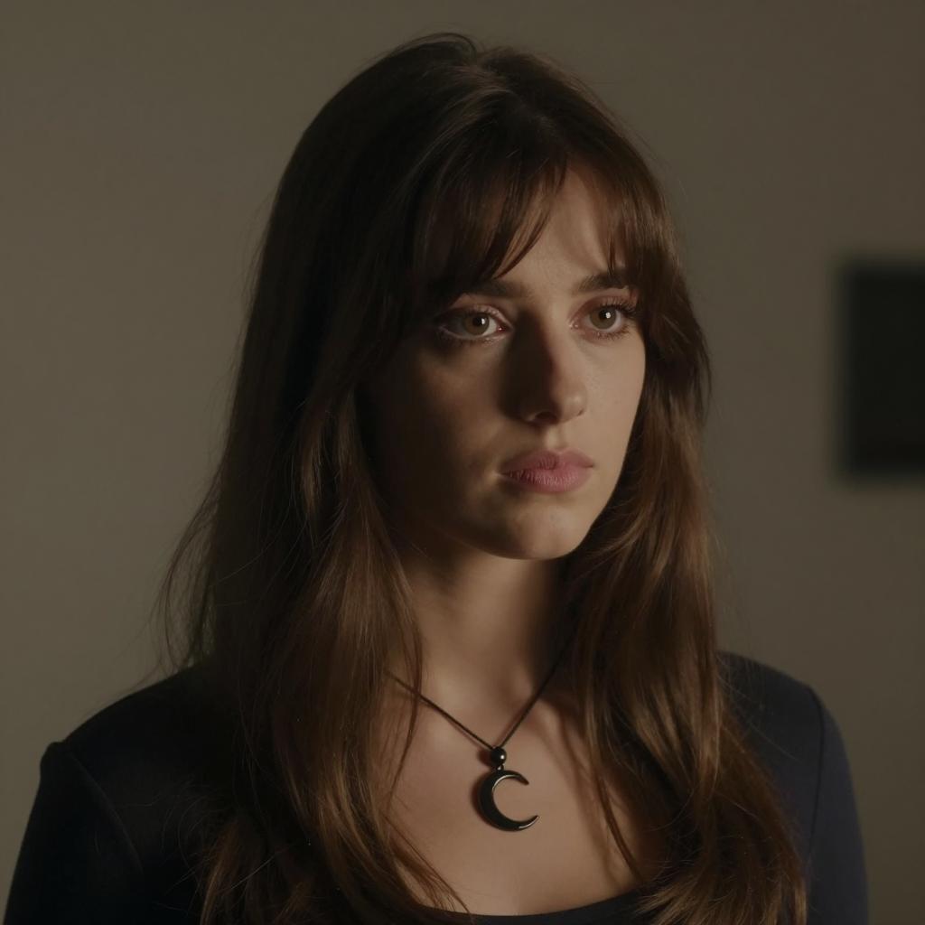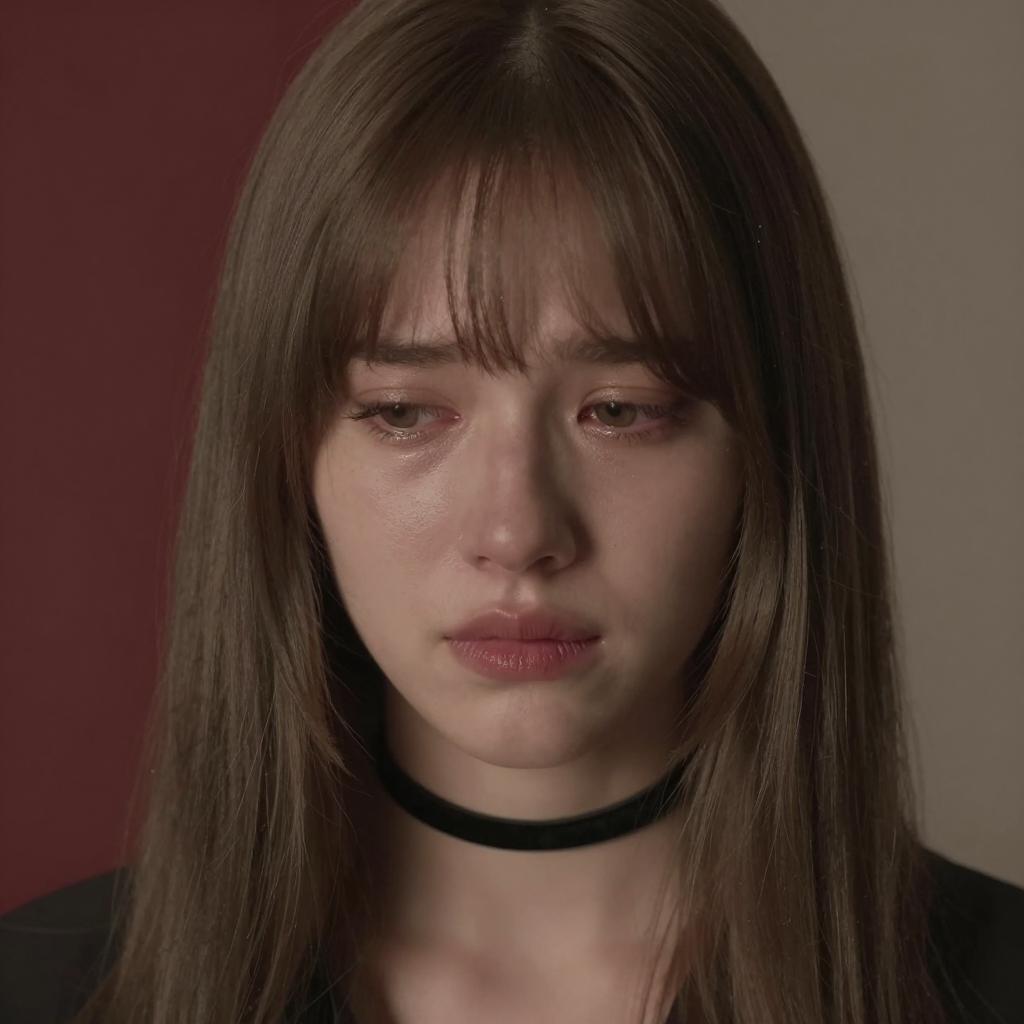 Close-up photograph of a young woman with straight brown hair and bangs, looking down with a sad, tearful expression. She wears a black choker necklace. Background is blurred, with red and brown colors. She has fair skin and light brown eyes. Frame is slightly off-center.