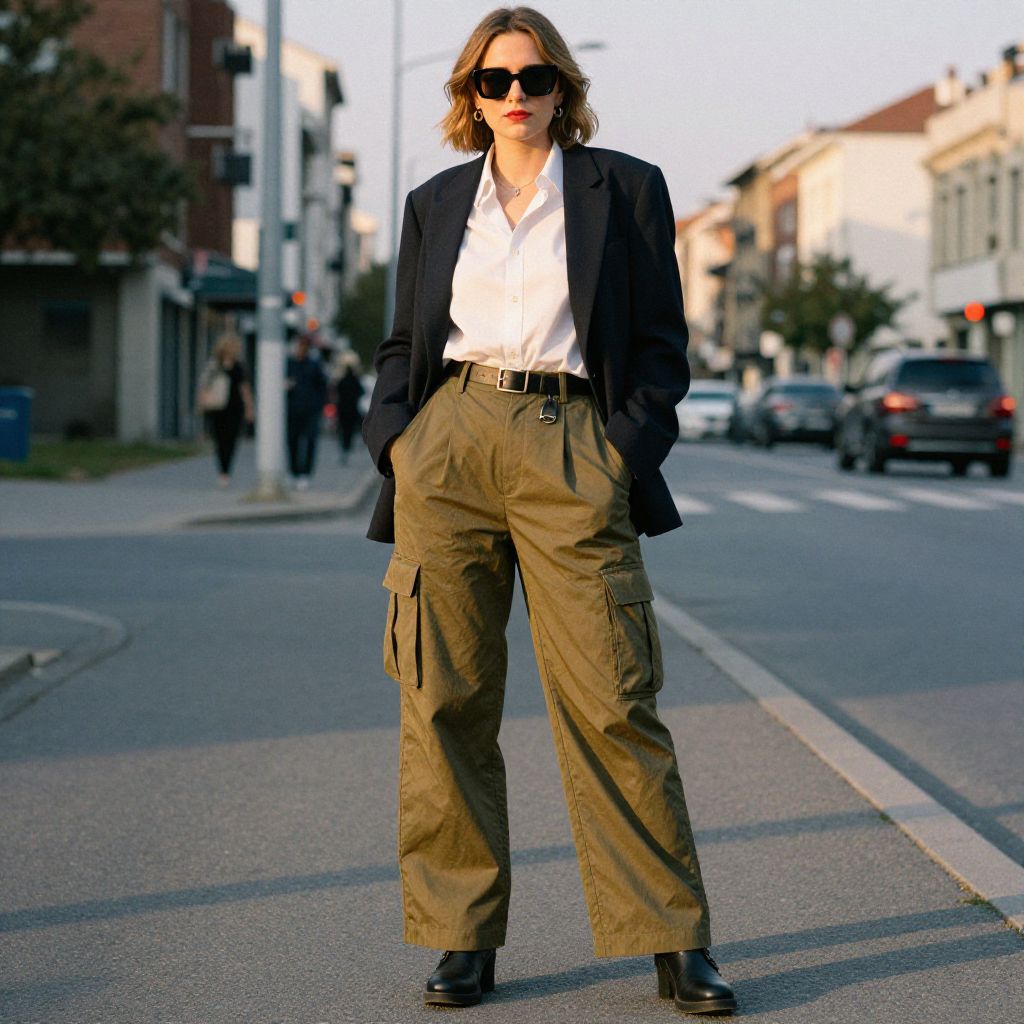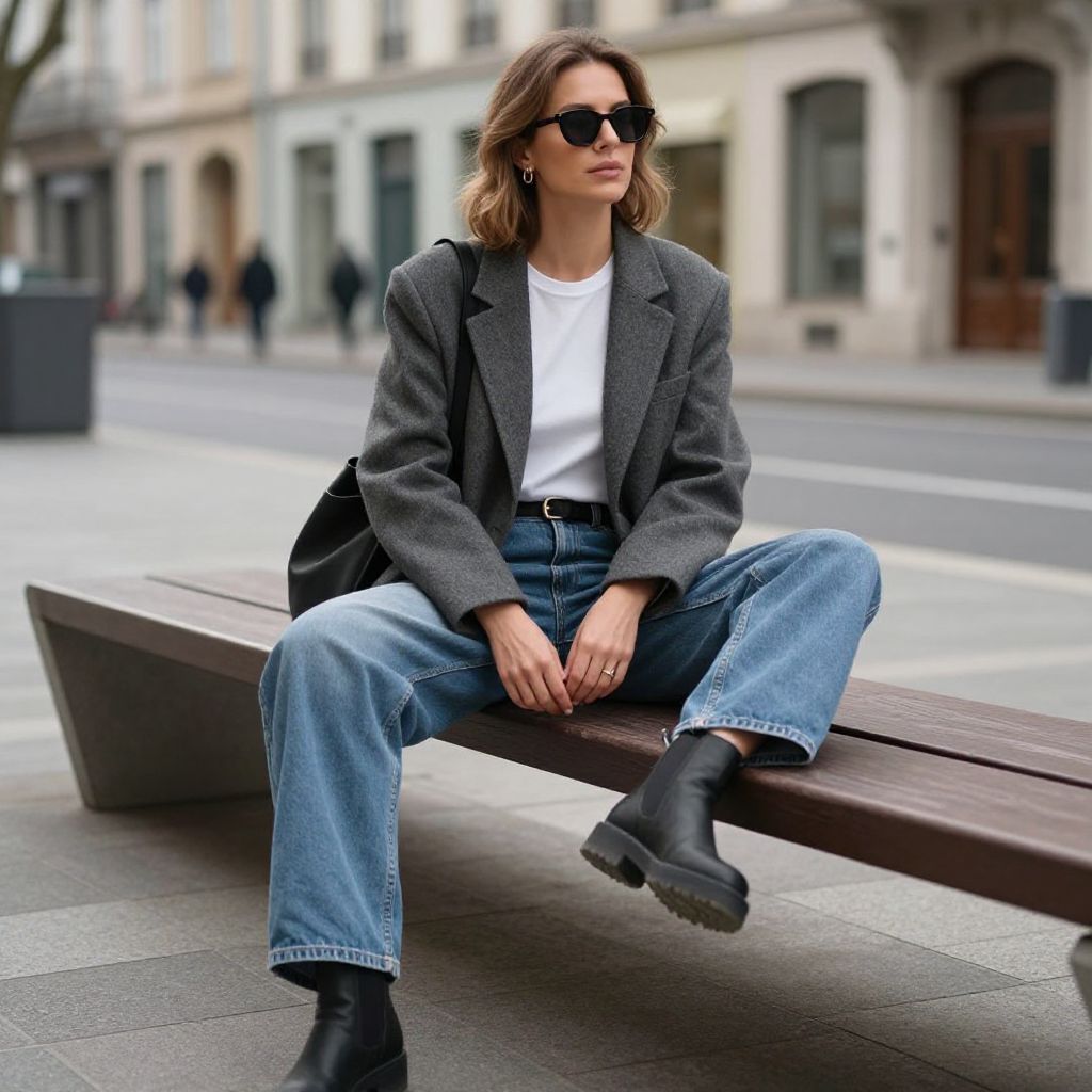 Urban street style, European woman, capturing a woman with a minimalist yet striking fashion aesthetic, walking through a trendy city street lined with boutique stores and street art, with a focus on clean lines and neutral tones in her outfit.