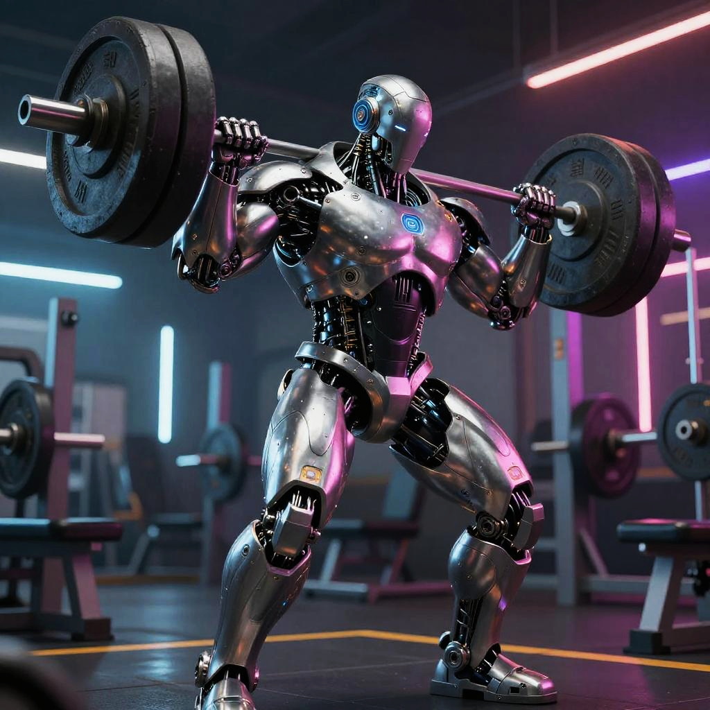 Bodybuilder AI, a futuristic humanoid robot with exaggerated muscular anatomy, lifting massive weights in a high-tech gym, neon lights reflecting off metallic muscles, cyberpunk style, dynamic pose, hyper-realistic detailing, digital art
