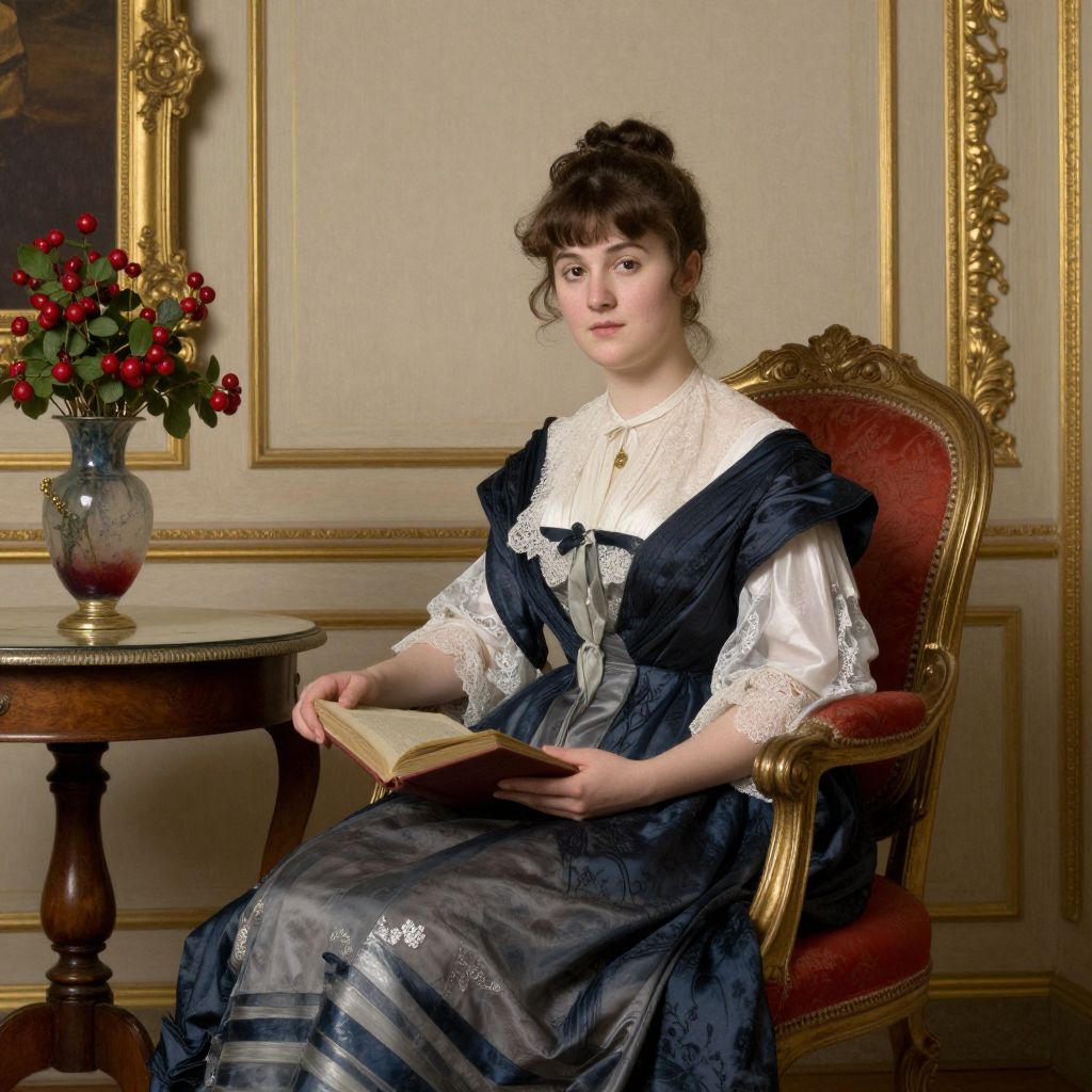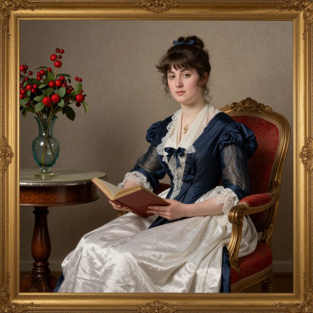 George Elgar Hicks's portrait of a woman in a serene setting, featuring her seated in a red upholstered chair, dressed in a dark blue and white gown with lace details, holding an open book, accompanied by a vase of red berries on a wooden side table, all framed in ornate gold, evokes the timeless elegance of 19th-century portraiture.