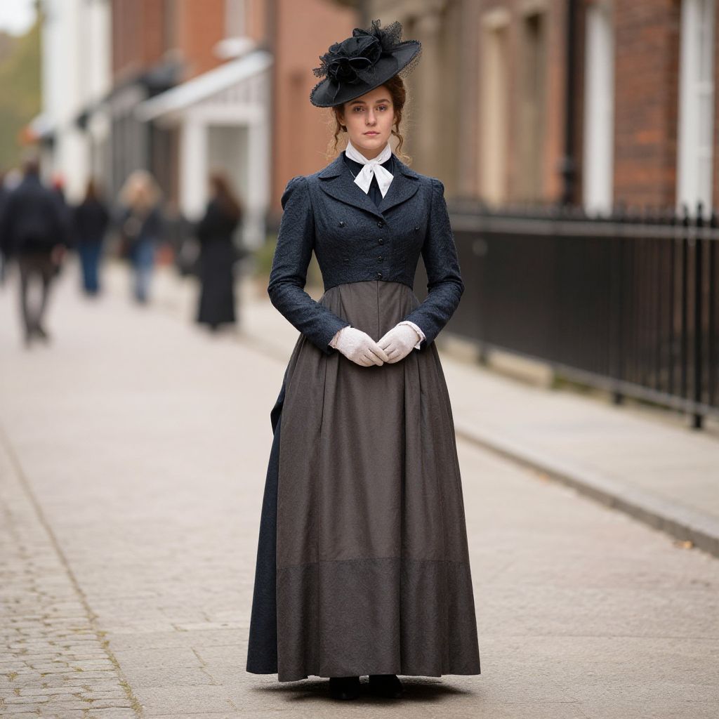 Victorian Riding Habit Costume, woman in a long dress and hat standing in a street