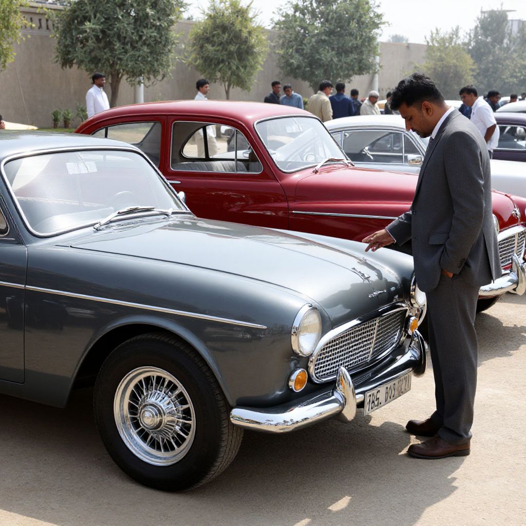 Vintage cars gleam under the sun at a classic car exhibition in Pakistan, showcasing timeless elegance as enthusiasts gather around, with a man in a suit inspecting a sleek gray sedan in the foreground.