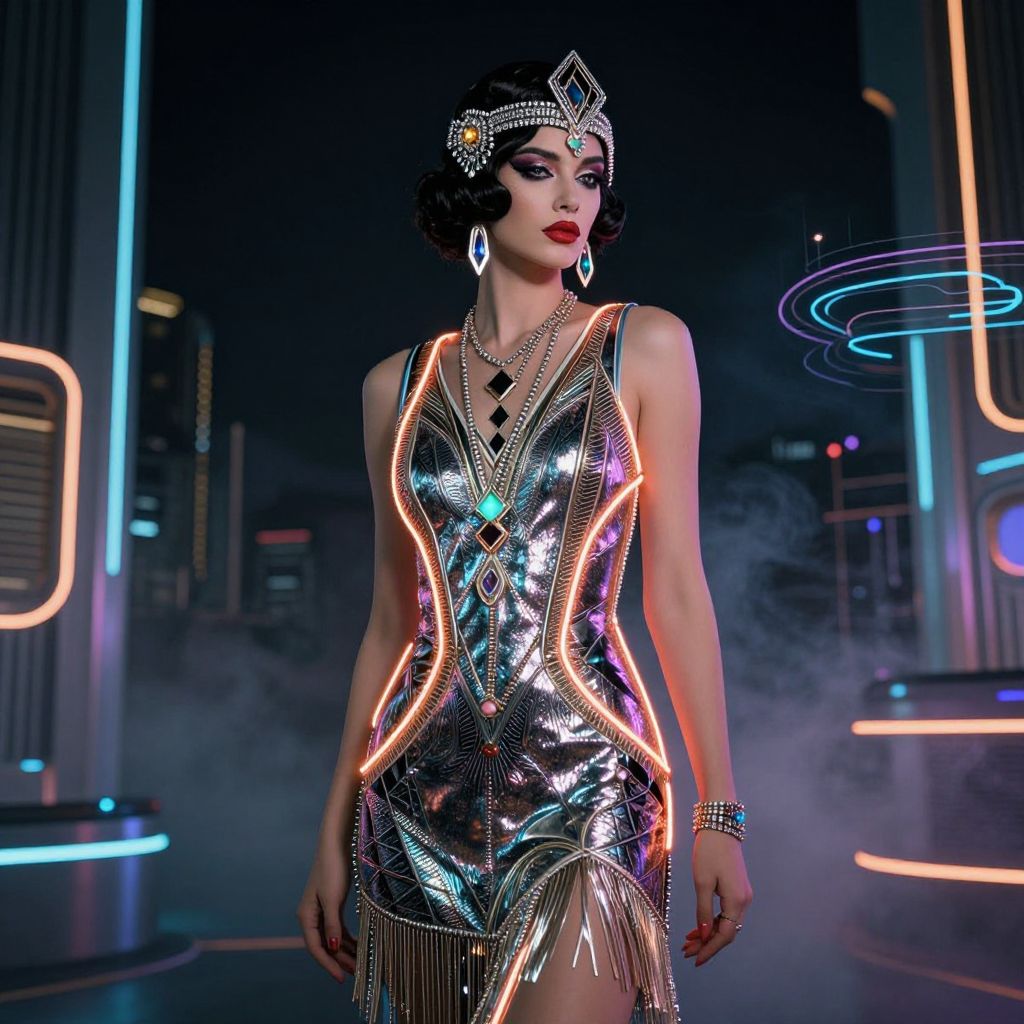 Photograph of a fair-skinned woman with dark, wavy bob hair, wearing a metallic silver, Art Deco-inspired dress with neon orange and blue accents, and fringe details. She has red lipstick, dark eye makeup, and wears a jeweled headpiece and matching jewelry. The background is a futuristic, neon-lit cityscape with glowing blue and orange lines and mist. Her confident stance and poised expression exude a vintage, flapper-style elegance in a modern, cyberpunk setting. The image has a high-contrast, vibrant color palette.