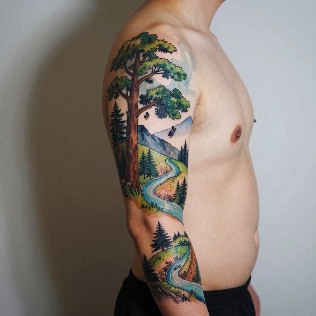 Photograph of a shirtless man with a colorful, detailed tattoo of a winding river, trees, and mountains on his right upper arm.