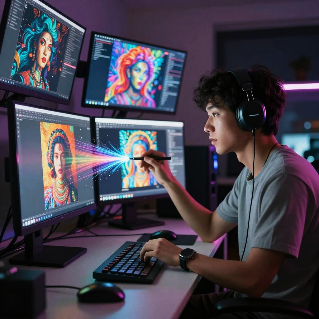 Photograph of a young man with curly hair, wearing headphones, creating vibrant digital art on multiple monitors in a dimly lit room.
