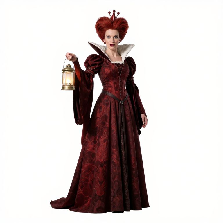Photograph of a fair-skinned woman with long, wavy red hair, smiling widely. She wears a vibrant red, medieval-style gown with a fitted bodice, detailed with gold embroidery, and a full skirt adorned with intricate patterns. The gown features shoulder armor-like accents. She stands on a stage with dark red curtains in the background, a vintage-style chair to the left, and a decorative, square patterned piece to the right. The lighting highlights her radiant smile and the rich texture of her gown. The overall scene suggests a theatrical performance.