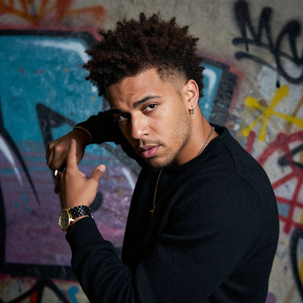 Jcole hair street style, urban portrait of a man with defined natural curls and a well-maintained afro hairstyle, graffiti wall in background, dynamic pose with confident expression, cinematic lighting with high contrast and depth