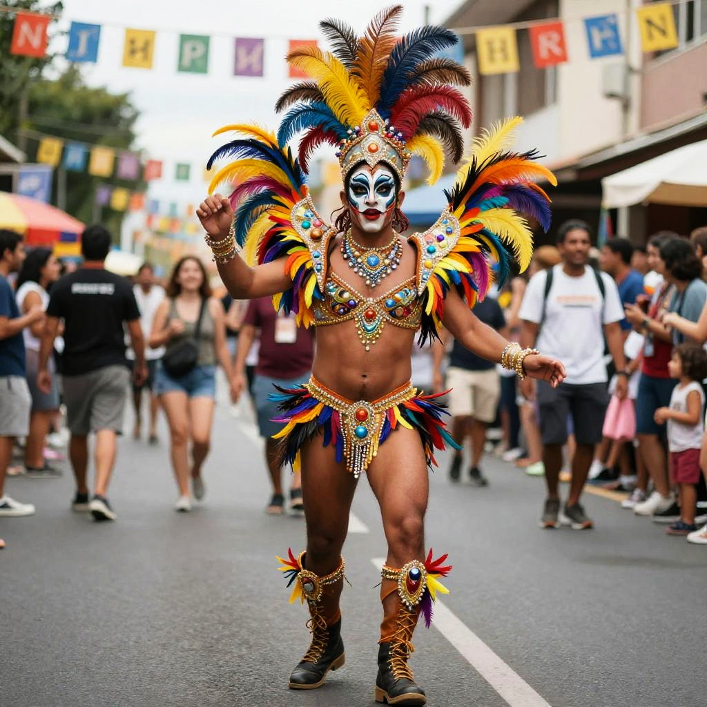Flamboyant style street performer in an elaborate costume with bright feathers, sequins, and intricate makeup, performing on a bustling city street during a festival, surrounded by an enthusiastic crowd and colorful decorations.
