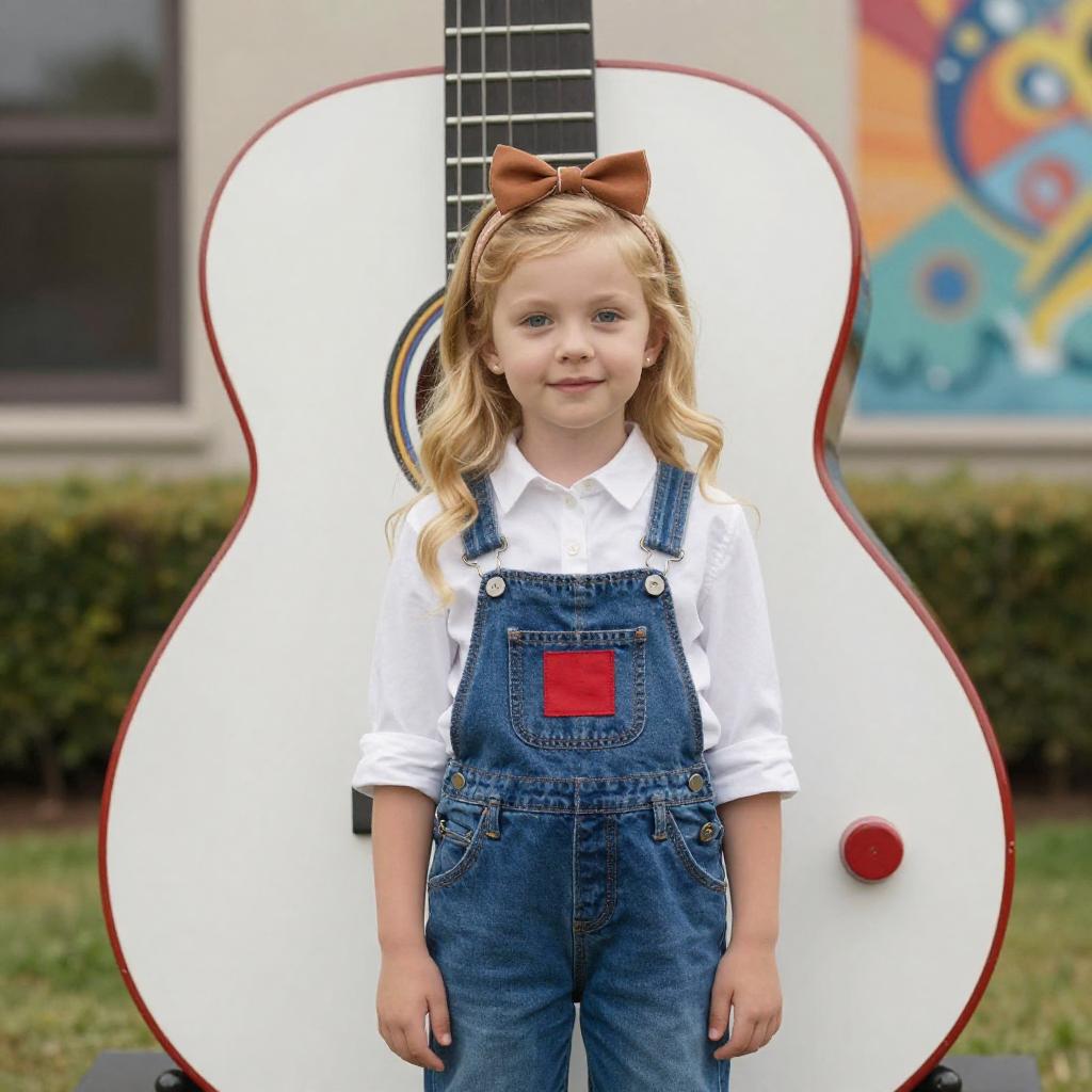 Photograph of a young blonde girl with wavy hair, wearing a white shirt and blue denim overalls with a red patch, and a brown bow headband. She stands in front of a large, white, guitar-shaped sculpture with red accents, set against a background of greenery and a building with a mural.