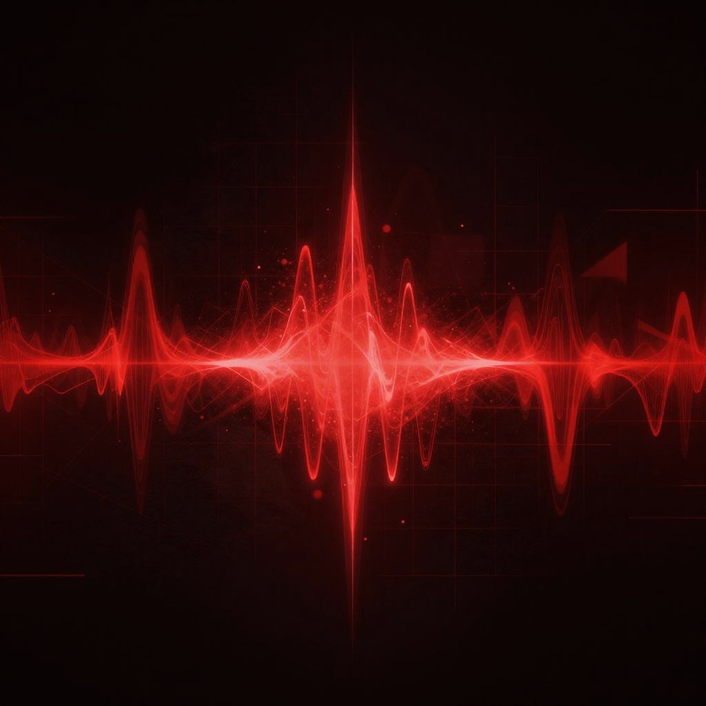 Generate a red and black Discord banner featuring a dark, textured background with pulsating red waveforms and angular abstract shapes, combined with subtle particle effects and digital grids to create a high-energy futuristic aesthetic.