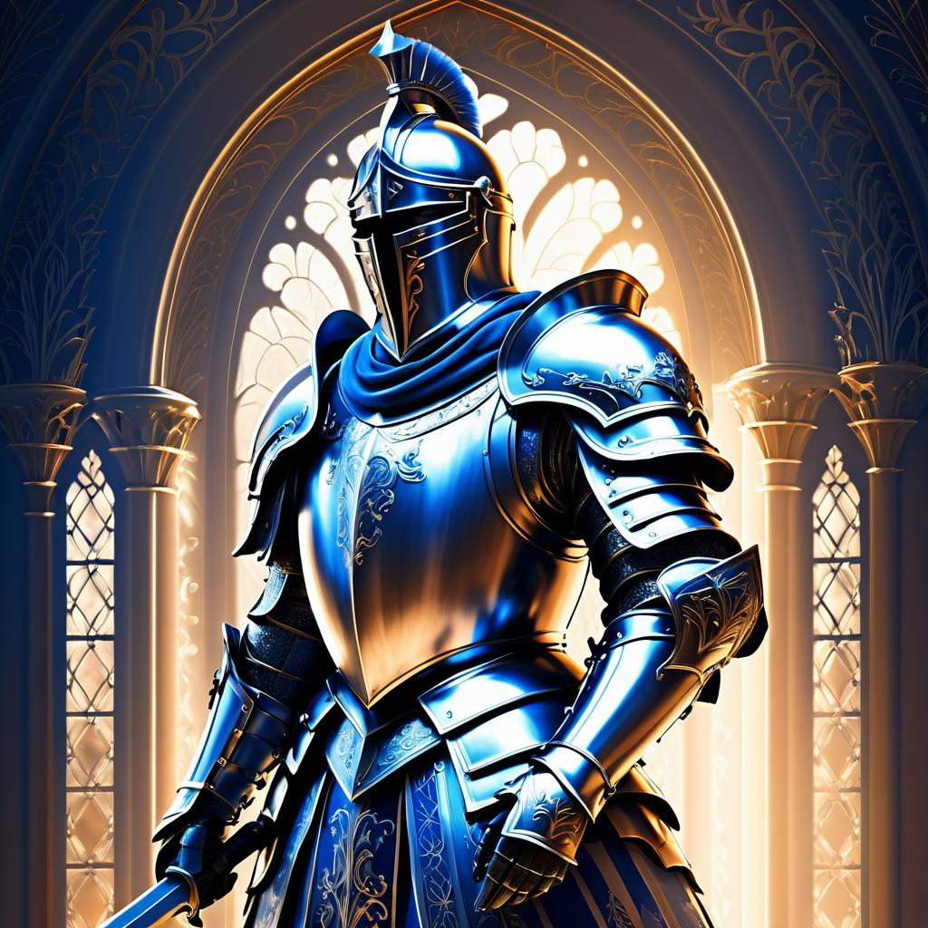 A digital painting of a knight in shining armor, regal and romantic style, warm diffused lighting, intricate armor details, silver and blue tones, stunning and awe-inspiring composition