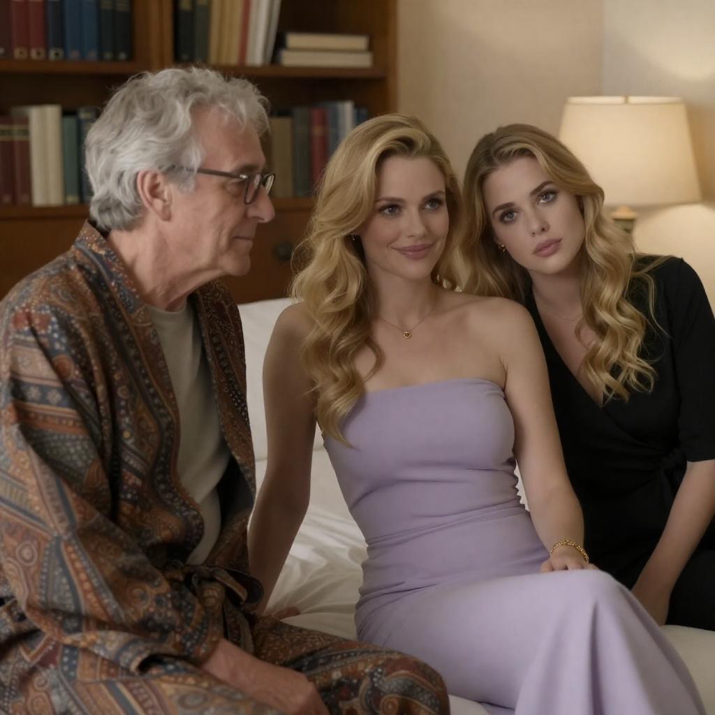 Photograph of five women on a green plaid sofa. Blonde woman in leopard print dress and gold boots on left. Middle woman in blue shirt, black fishnet stockings, covering mouth. Large beige teddy bear between middle and right women. Right woman in black lace dress with bangs. Far right woman in brown dress. Coffee table with snacks, soda, and beer in foreground. Living room with white fireplace and curtains in background. Women smiling or laughing.