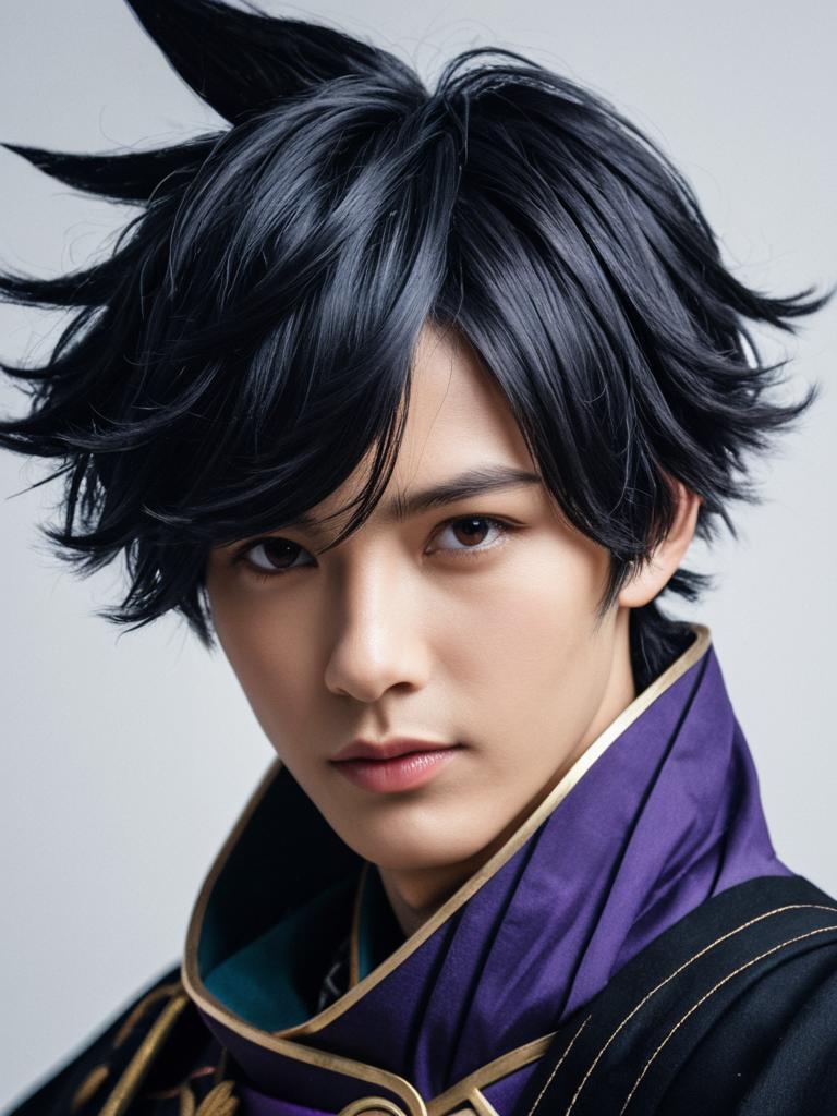 Man in Childe Genshin Costume, close-up detailed headshot with styled hair