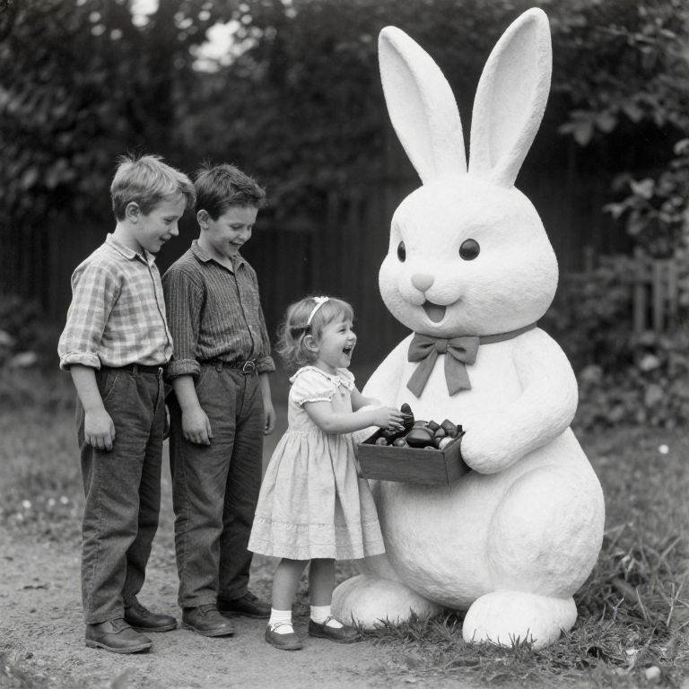 Wet-On-Dry 2 small boys and one little girl laughing and smiling, playing with a giant Easter bunny who Carie’s a box of chocolate. 19th century black and white photography.,