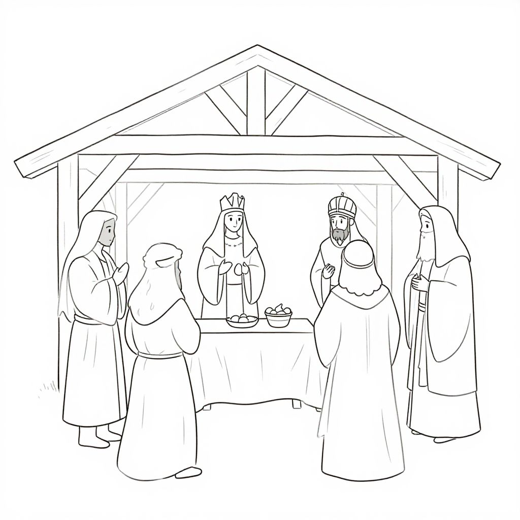 Nativity line art featuring the stable scene with shepherds and wise men, clean linear art with thin, precise strokes, minimalistic and contemporary, emphasizing spiritual and peaceful mood in a hand-drawn style on blank background