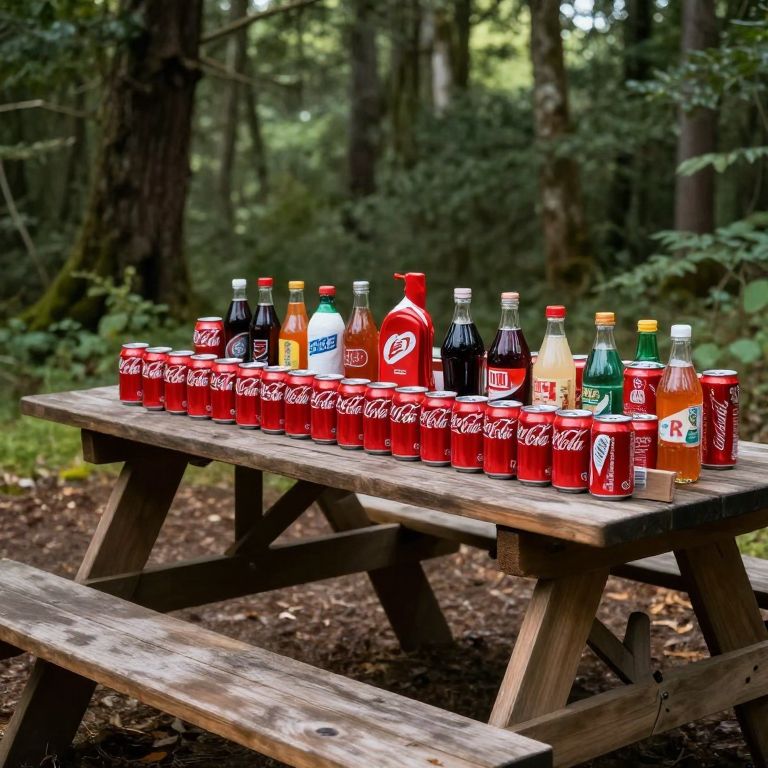 Offerings of predominantly red beverages, including numerous Coca-Cola cans and other assorted drinks, are meticulously arranged atop and beneath a wooden picnic table within a forested area, suggesting a ritualistic or commemorative purpose.