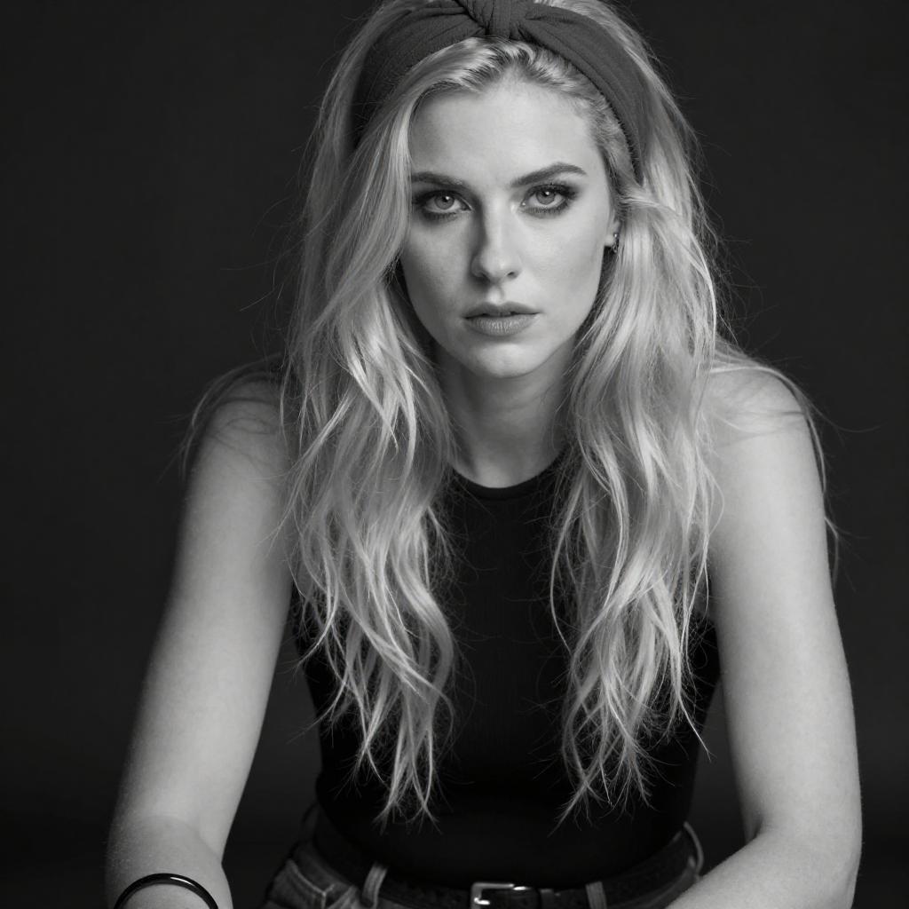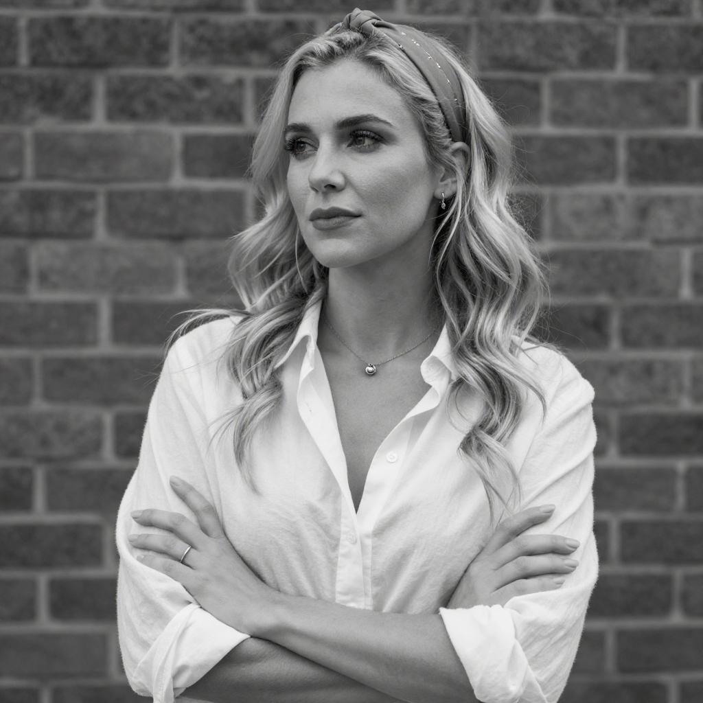 Black-and-white photograph of a blonde woman with wavy hair, wearing a white, partially unbuttoned blouse, and a headband. She stands with arms crossed, looking slightly to the left, with a blurred brick wall background. She wears a necklace with a small pendant. Her expression is calm and confident.