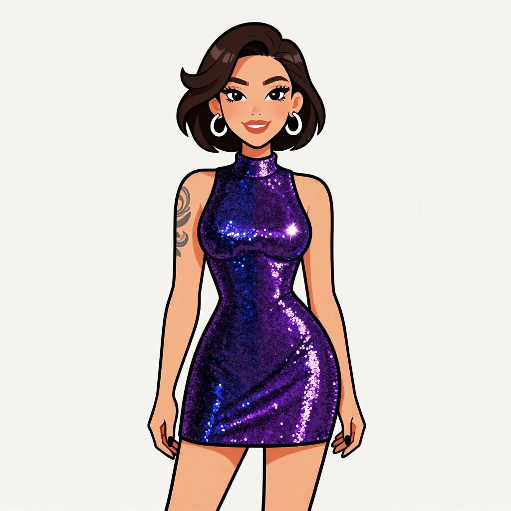 Woman with pretty face and pretty hair. smiling Woman, party-ready, sequined mini dress in a vibrant mix of purple and blue, high neck, sleeveless, body-hugging silhouette, above-knee length, subtle sparkle, tattoo on left arm, large circular earrings, hair in a casual updo, plain light background. --sref 1461
