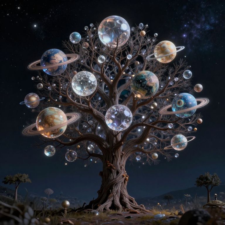 Digital artwork of a cosmic tree with glowing, transparent planets and rings as leaves, set against a starry night sky.