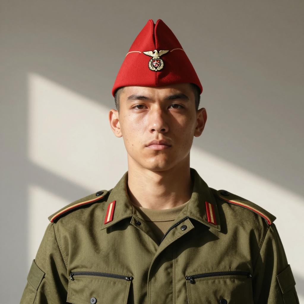 Military costume man, photograph of a handsome male soldier, medium skin tone, short dark hair, well-groomed mustache, brown leather military uniform with red accents, black and red peaked cap with gold emblem, brown shoulder strap, serious expression, outdoor background, blurred greenery and white columns, bright sunlight, realistic style, portrait orientation, head and shoulders shot, focused on face, detailed ures on uniform and cap, traditional military attire, well-lit, high-quality image