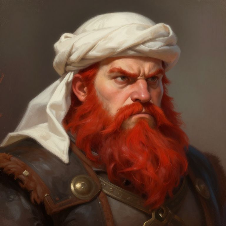 "Nature grumpy viking with arab turban on head, overweight, fat, red hair and beard, portrait, fantasy, rpg, dungeons and dragons, concept art, digital painting, oil painting,"