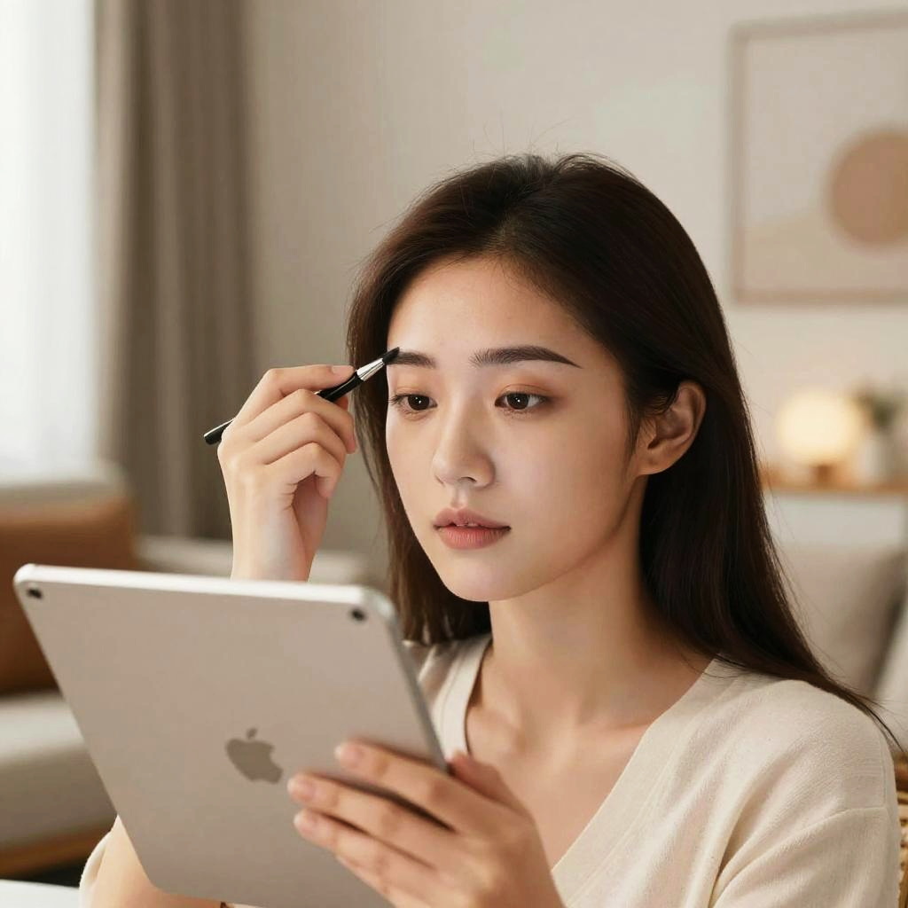 Eyebrow shape simulator scene with a person using a tablet, experimenting with different eyebrow shapes, modern stylish room background, natural makeup look, warm ambient lighting, realistic facial features, digital beauty innovation.
