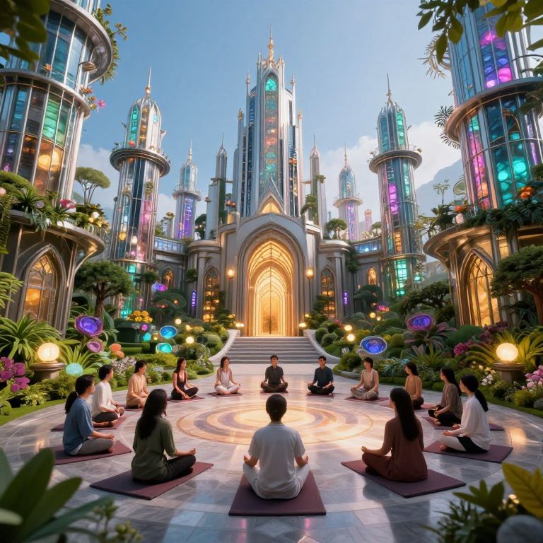 Metal create fantasy glass city surrounded with gardens, beautiful grand architecture, a group of people meditating in a circle, bright prime colored lights, cinematic,