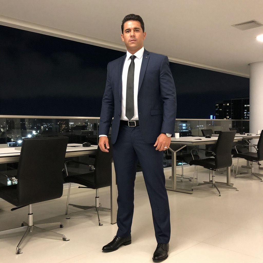 Photograph of a young man standing in a modern, brightly lit office with large floor-to-ceiling windows in the background. He has short, dark hair and a clean-shaven face. He is wearing a dark navy blue suit with a white dress shirt and a black tie. His black leather shoes are polished. The office features sleek, black leather chairs and white desks arranged in rows. The night sky and city lights are visible through the windows. The man's posture is confident, with his hands by his sides and a slight smile on his face.