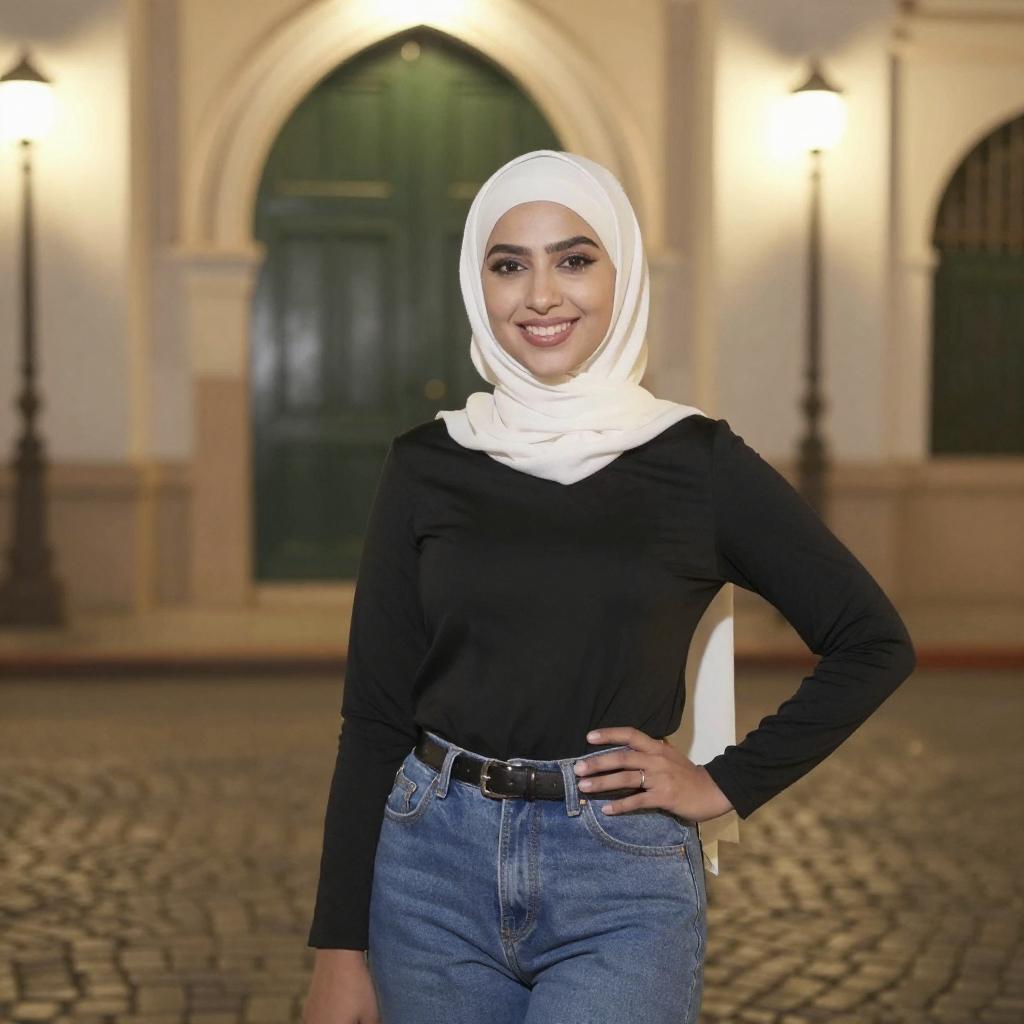 Photograph of a smiling young woman with medium brown skin and dark brown eyes, wearing a white hijab, black long-sleeve top, and high-waisted blue jeans with a black belt. She has a slender build and stands with one hand on her hip. The background features a cobblestone courtyard with illuminated arched doorways and green doors, framed by beige stone walls and two tall, black, wrought-iron lamps. The lighting is warm, highlighting the woman's face and outfit.