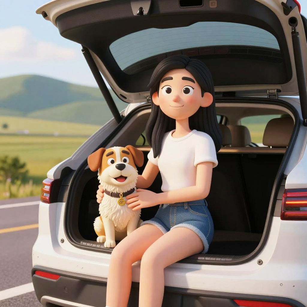 3D cinematic film.(caricature:0.2). 4k, highly detailed, young smiling woman and her dog sitting the trunk of a car during roadtrip