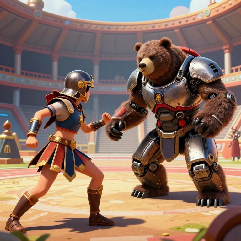 A vibrant, futuristic gladiator arena features a dynamic battle between a teenage gladiator and a robotic bear, rendered in a Michael Page, Iisa Frank, Dali style, with intricate details and a John Romita influence, showcasing an unreal engine test with great colors and realism.