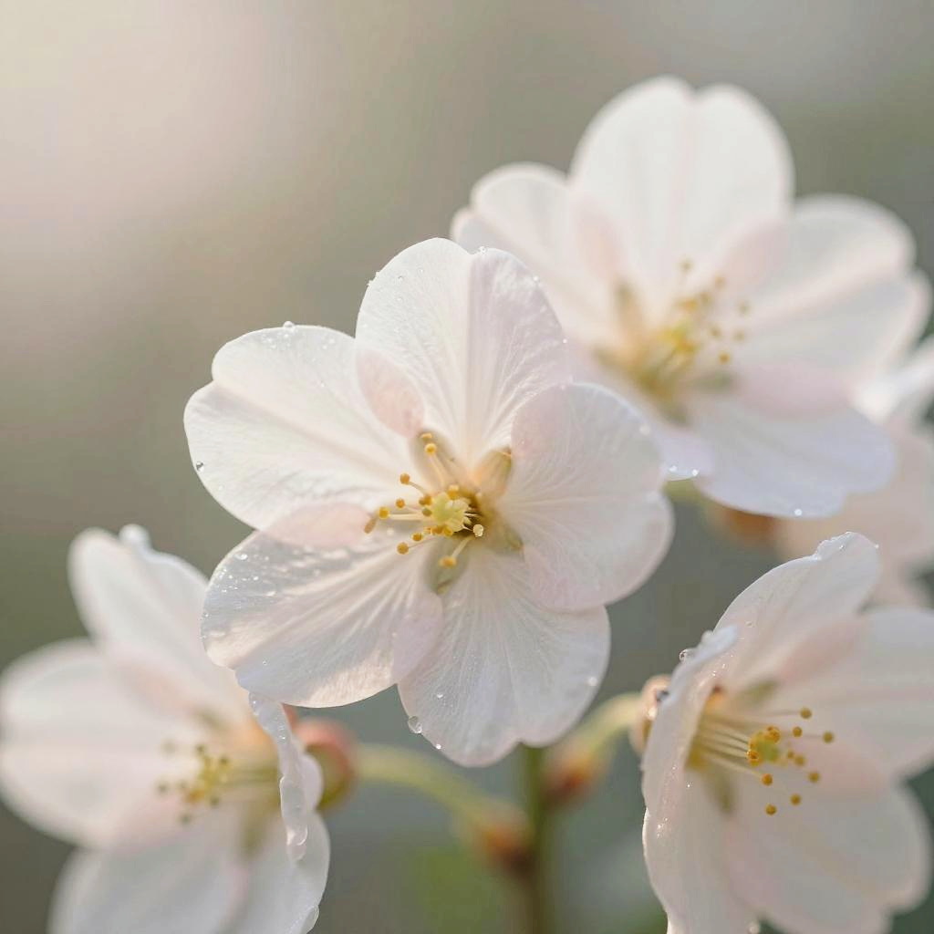 Stable diffusion photography prompts featuring close-up shots of delicate flowers with soft, diffused sunlight illuminating translucent petals, creating a peaceful, almost magical ambiance with fine texture details and harmonious color blending.