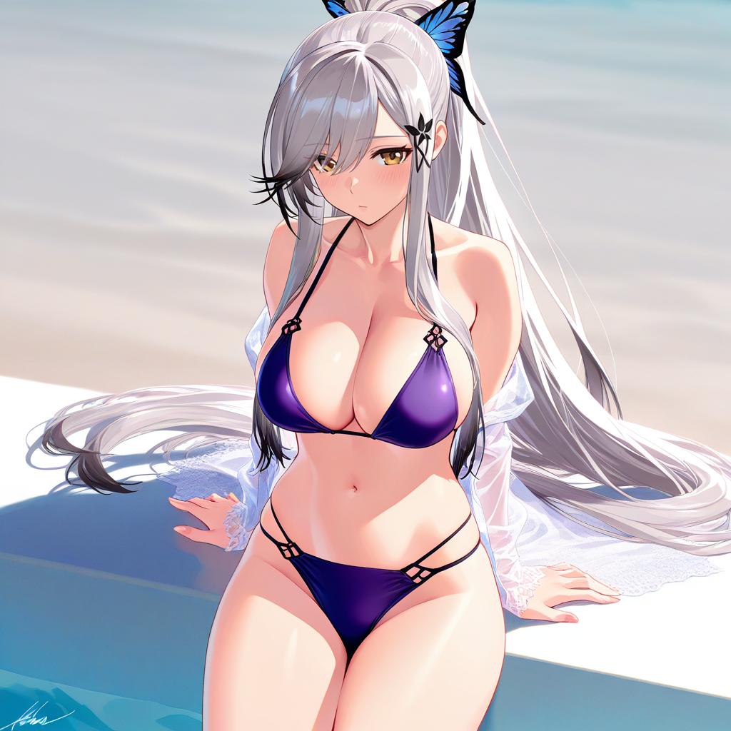 Digital illustration of an anime girl with very long grey hair styled in a ponytail adorned with a blue butterfly hair ornament. She has large breasts, pinkish-red eyes, and is wearing a purple bikini with strappy bottom details. The character sits by a pool with bare shoulders and visible navel, showcasing a subtle blush on her cheeks.