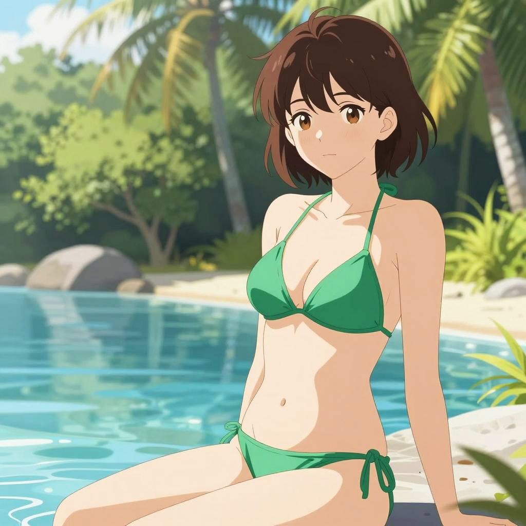 Anime woman in green bikini by tropical pool