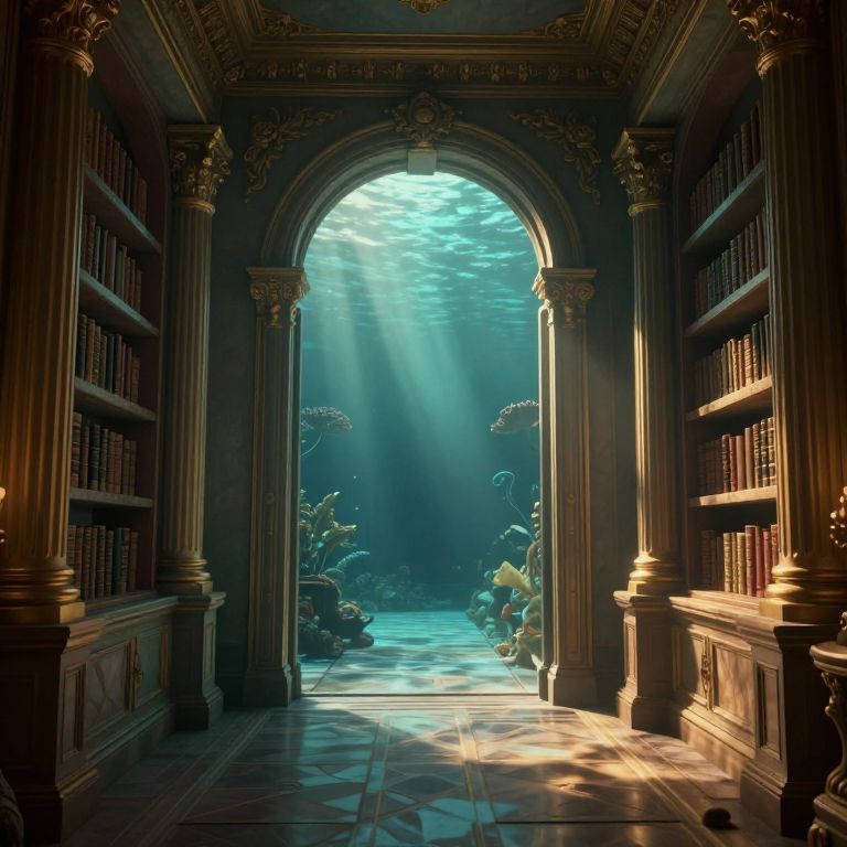 A hauntingly surreal 3D-rendered scene depicts an opulent interior with ornate columns and bookshelves, where a mysterious arched doorway reveals a submerged pathway leading into an ethereal underwater realm, illuminated by soft golden light and accentuated by dramatic lighting effects.