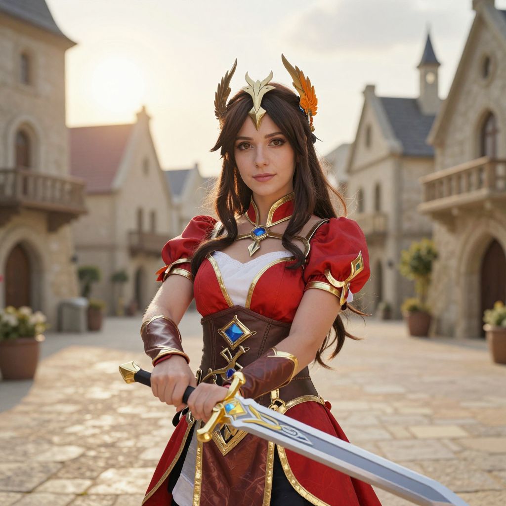 A detailed realistic photo of a brunette character in a vibrant cosplay costume, featuring a fantasy-inspired outfit with flowing red and gold accents, standing in a sunlit medieval village square with stone buildings and a backdrop of a rising sun, her face having soft brown eyes, full lips, and warm, natural-looking skin with defined features, wearing a crown shaped like a phoenix and holding a glowing sword in both hands.