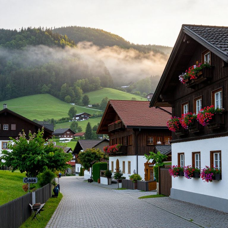 Photograph of a picturesque Alpine village at sunrise, featuring cobblestone street, wooden chalets with flower boxes, and mist-covered green hills in the