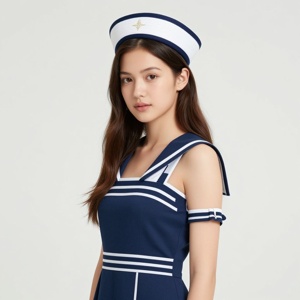 Nautical woman clothing, 1girl, solo, realistic, hat, sailor hat, long hair, brown hair, dress, looking at viewer
