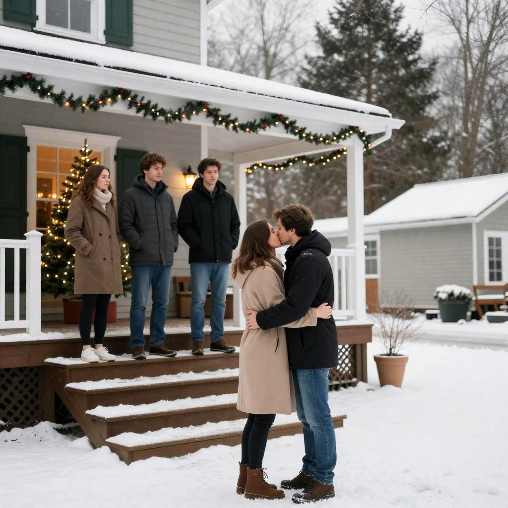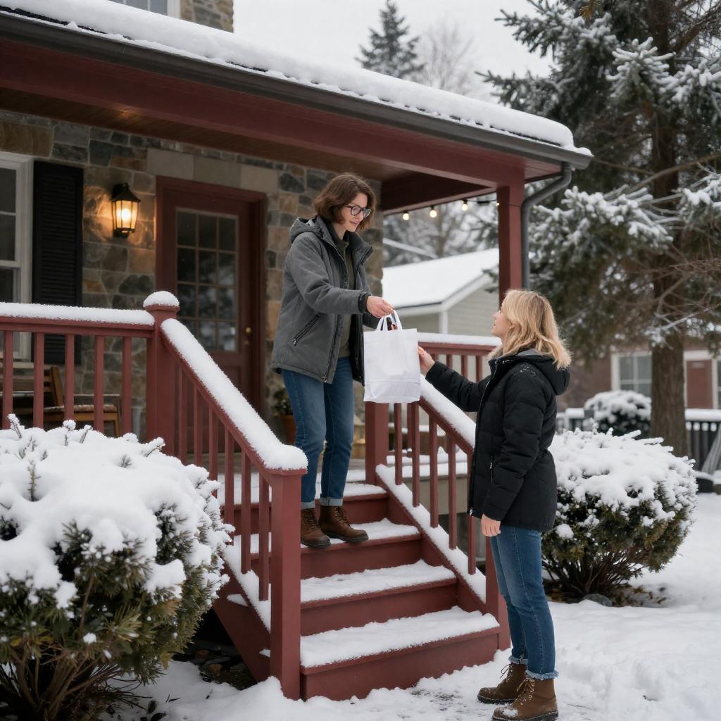 Photograph of a woman with short brown hair and glasses, wearing a gray jacket and blue jeans, standing on a red staircase, handing a white bag to a woman with blonde hair in a black jacket, standing on a snow-covered porch. Stone house, string lights, snow-covered bushes, and evergreen trees in the background. The blonde woman looks up at the brown-haired woman.