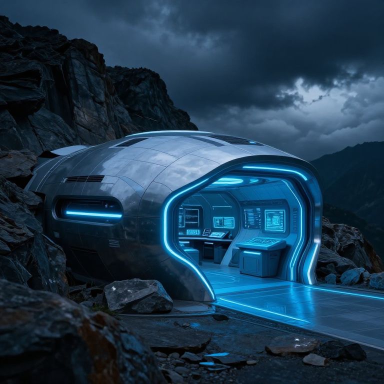 Photograph of a futuristic, silver, dome-shaped pod cabin with neon blue lighting, set on a rocky, mountainous terrain under a cloudy, dark blue sky. The pod has an arched, illuminated entrance revealing a high-tech, blue-lit interior with multiple screens and a control panel. The exterior reflects the rocky surroundings, while the interior contrasts with its sleek, modern design. The overall ambiance is sci-fi, with a focus on advanced technology in a rugged, natural setting.