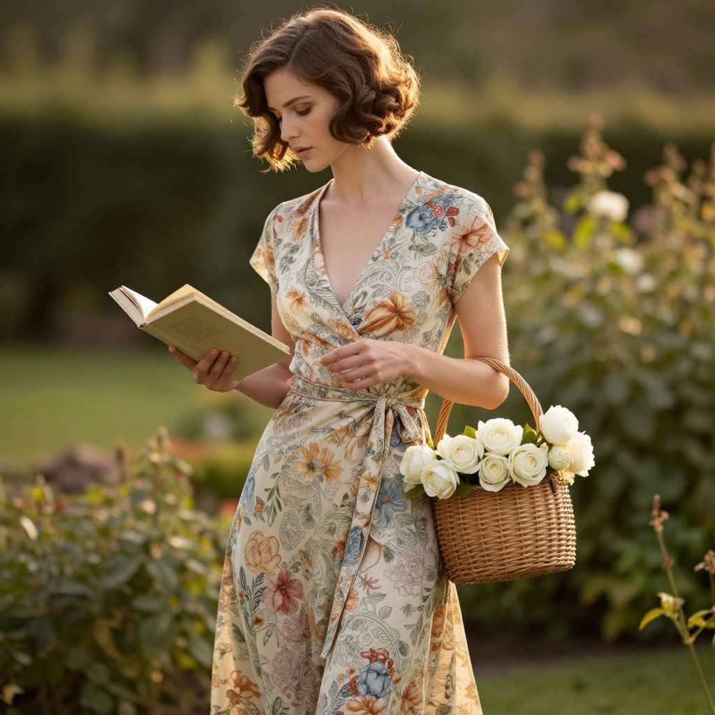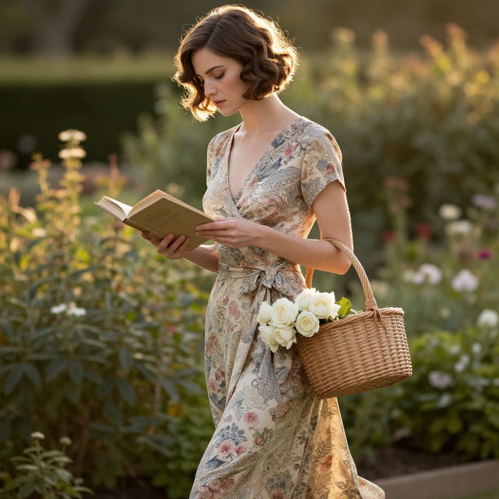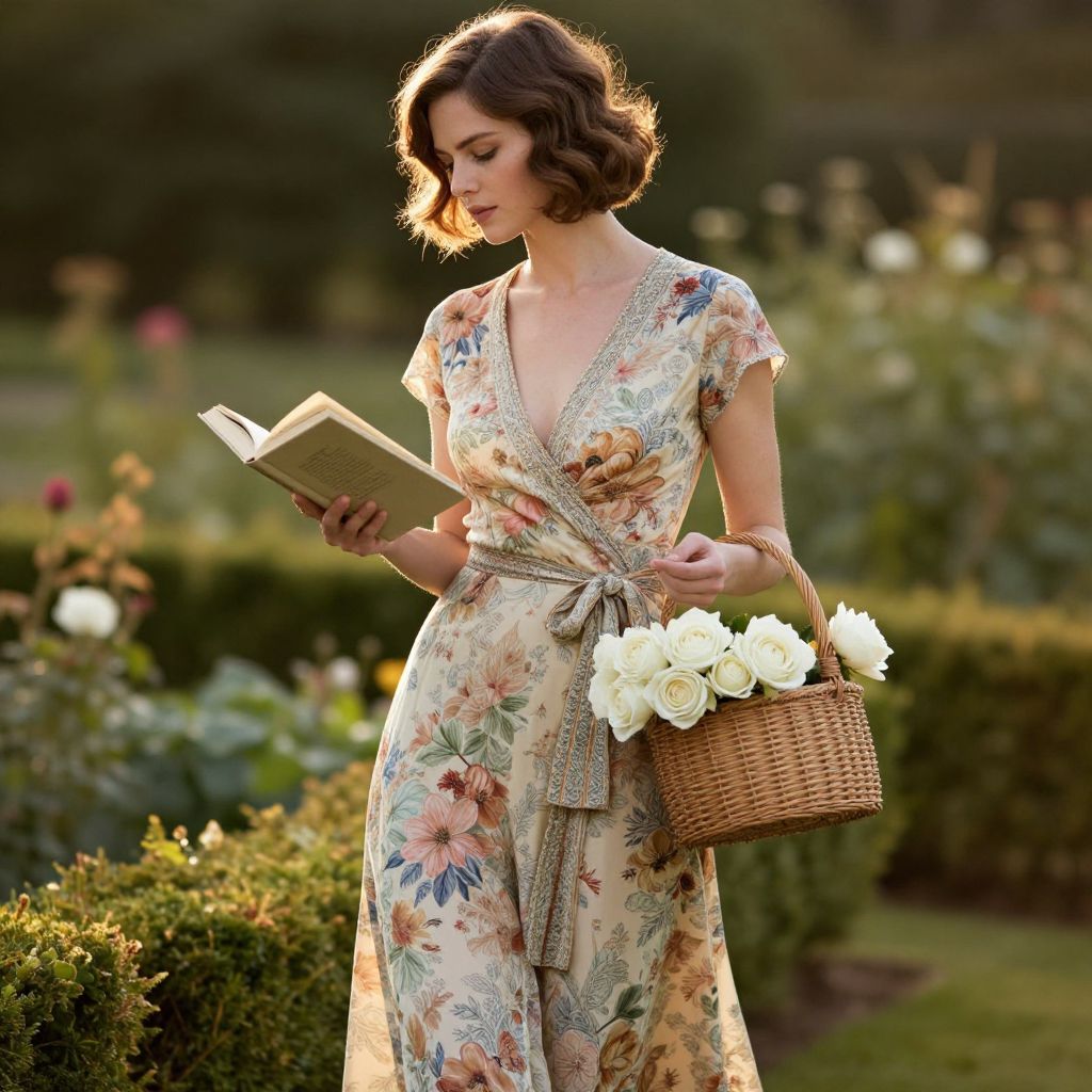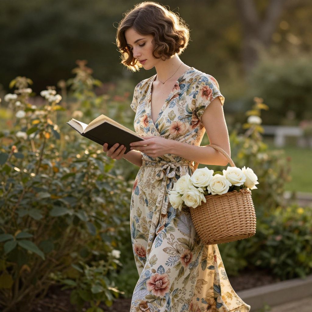 Parameters: 8k, photorealistic, HDR, high-end fashion photography, sharp detail, soft natural lighting, fine texture detail, editorial composition, vintage-inspired atmosphere, matte finish, Subject: A female model with a short, wavy bob haircut and natural, soft makeup, She is wearing a vintage-inspired, deep V-neck floral wrap dress with short sleeves and intricate patterns, The look exudes romantic elegance and vintage charm, blending timeless sophistication with modern editorial refinement, Pose: The model is captured in a three-quarter view, walking gracefully through a garden, Her head is gently tilted down, focused on an open book in her hands, Her posture is relaxed yet poised, and she carries a woven basket filled with white roses, positioned naturally against her hip, Action: The model is immersed in a serene garden during golden hour, leisurely reading the open book as she walks, Her delicate movement and soft expression create a dreamy, peaceful atmosphere, Instructions: Set in a verdant outdoor garden at golden hour, use warm, natural light to create a soft glow highlighting the model’s dress and features, Blur the greenery with a shallow depth of field to emphasize the subject, Style Reference: Inspired by the romantic allure of 70s fashion photography and Zimmermann campaigns, balancing soft textures and timeless elegance, Camera Settings: Sony Alpha 7R IV, 85mm f/1, 8 lens, ISO 100, f/2, 8 aperture, 1/250 shutter speed