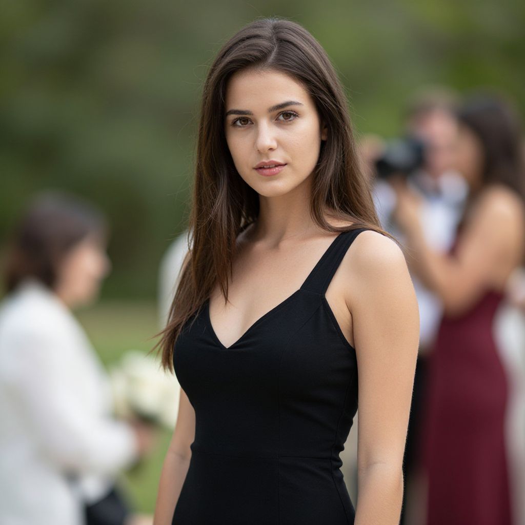 "black dress wedding party, 1girl, solo, dress, black dress, brown hair, long hair, looking at viewer, brown eyes, breasts, outdoors, blurry, blurry background, flower Realistic photo of casual sexy person with pretty face"