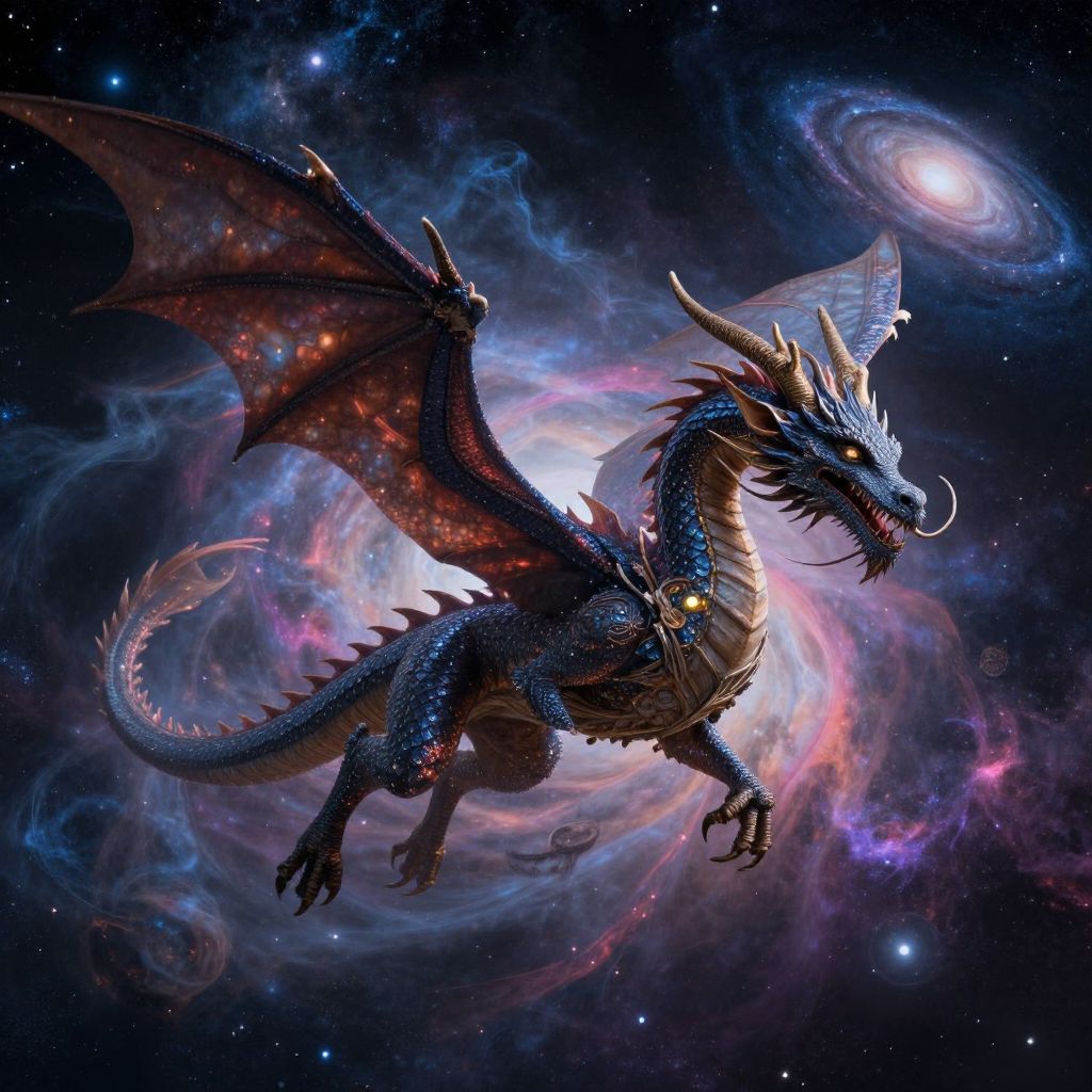 A surreal digital artwork depicting a majestic dragon soaring through an infinite cosmic landscape, with vibrant nebulae and distant galaxies swirling around its colossal frame. The dragon's scales glisten like stars against the vast expanse of space, while its ancient eyes hold wisdom beyond human comprehension. This image captures both the awe-inspiring beauty of nature and the boundless mystery of the universe, evoking a sense of wonder and humility in the viewer as they contemplate the cosmic journey of this mythical creature. The artwork's style is characterized by dreamlike elements and intricate details, reminiscent of surrealist masters who explored the realms of imagination and reality.
