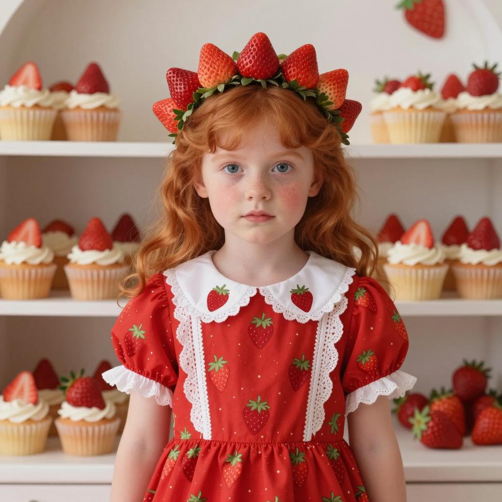Aesthetic strawberry, photorealistic, young red-haired girl, strawberry theme, wearing red dress with strawberry patterns, white trim, white collar, strawberry crown, standing in front of shelves with strawberry cupcakes and strawberries, soft lighting, detailed ures, realistic skin and hair, slight blush on cheeks, calm expression, kitchen or bakery background, warm colors, semi-saturation, bokeh background, detailed fabric folds, digital art, T2I, realistic style