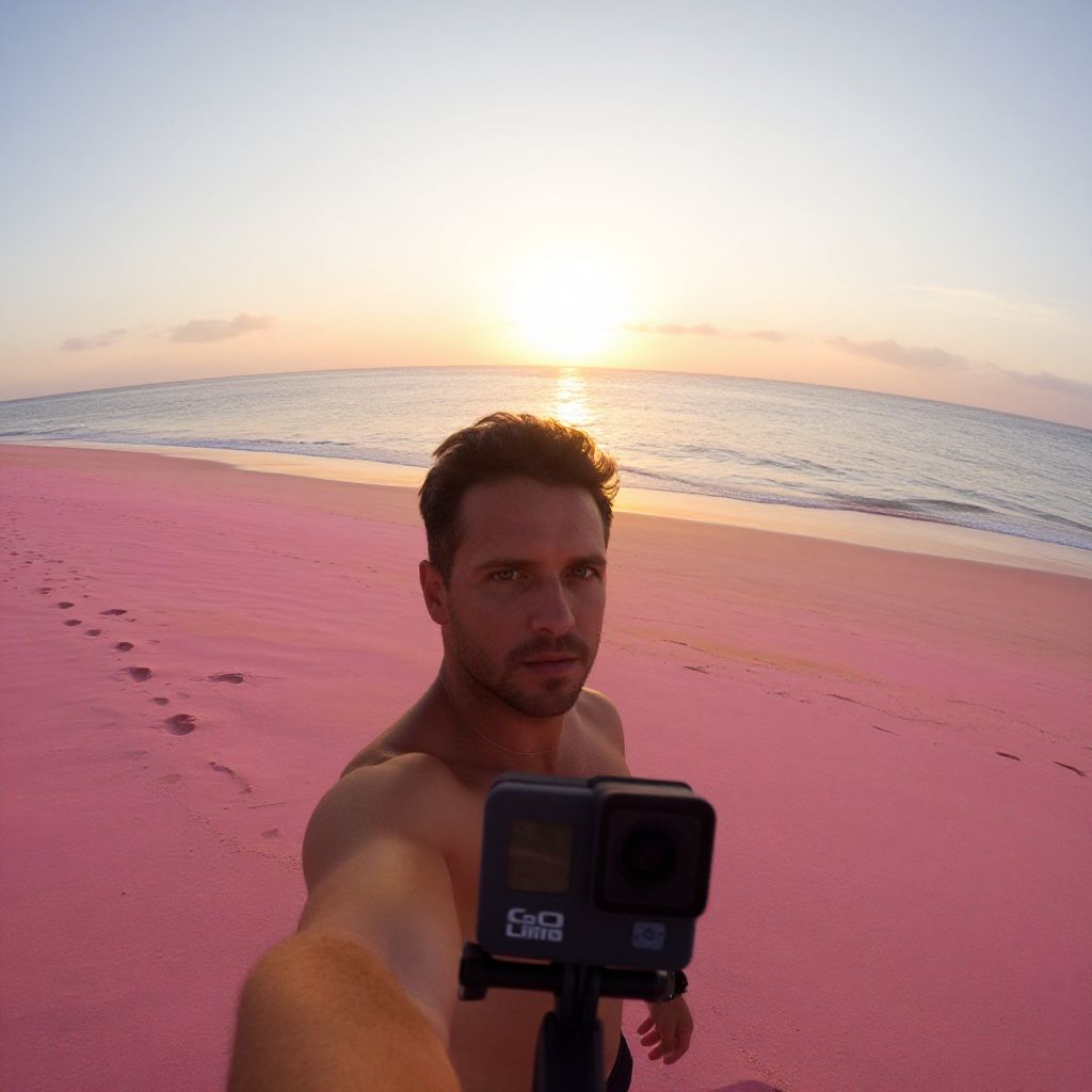 Captivating moment: man standing alone on a vibrant pink sand beach, as the sun dips into the ocean, casting warm golden hues across the sky. First-person POV from a GoPro camera, placed near his feet, capturing the serene atmosphere and peaceful solitude of this tropical paradise. Soft focus, shallow depth of field, emphasizing the subject's presence amidst Man has masculine face and piercing eyes
