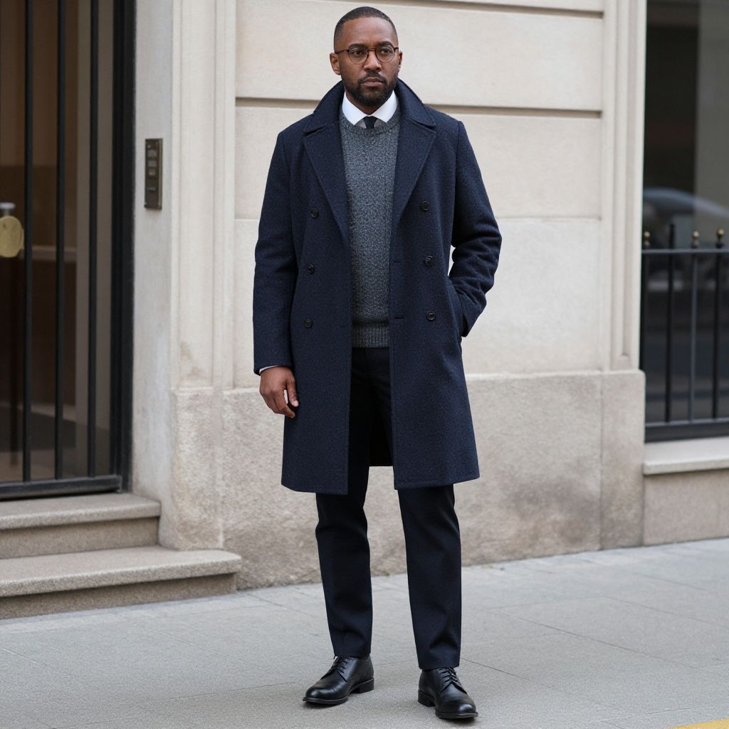 Fashion Jumpers Costume, man in a coat and sweater standing on a sidewalk