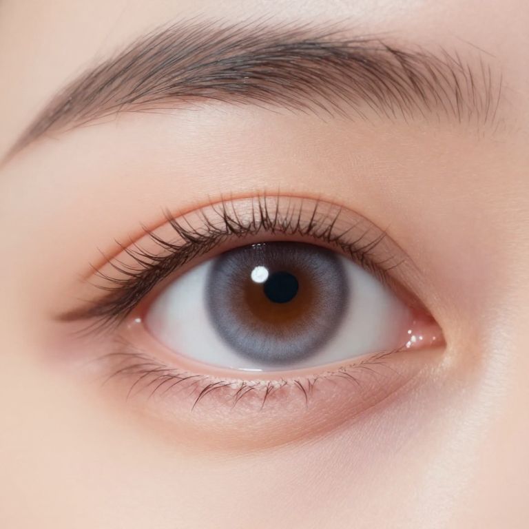 Close-up photograph of a blue-gray eye with long eyelashes, thick dark eyebrow, and subtle pinkish-white skin, highlighting detailed iris and pupil.