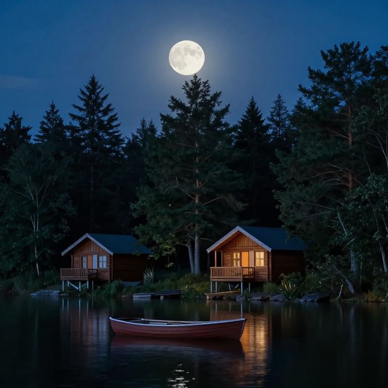 Moonlit night serenely illuminates a tranquil lakeside scene, featuring two cozy wooden cabins nestled among tall evergreen trees, with a full moon glowing brightly above and a small rowboat gently floating on the calm waters below.